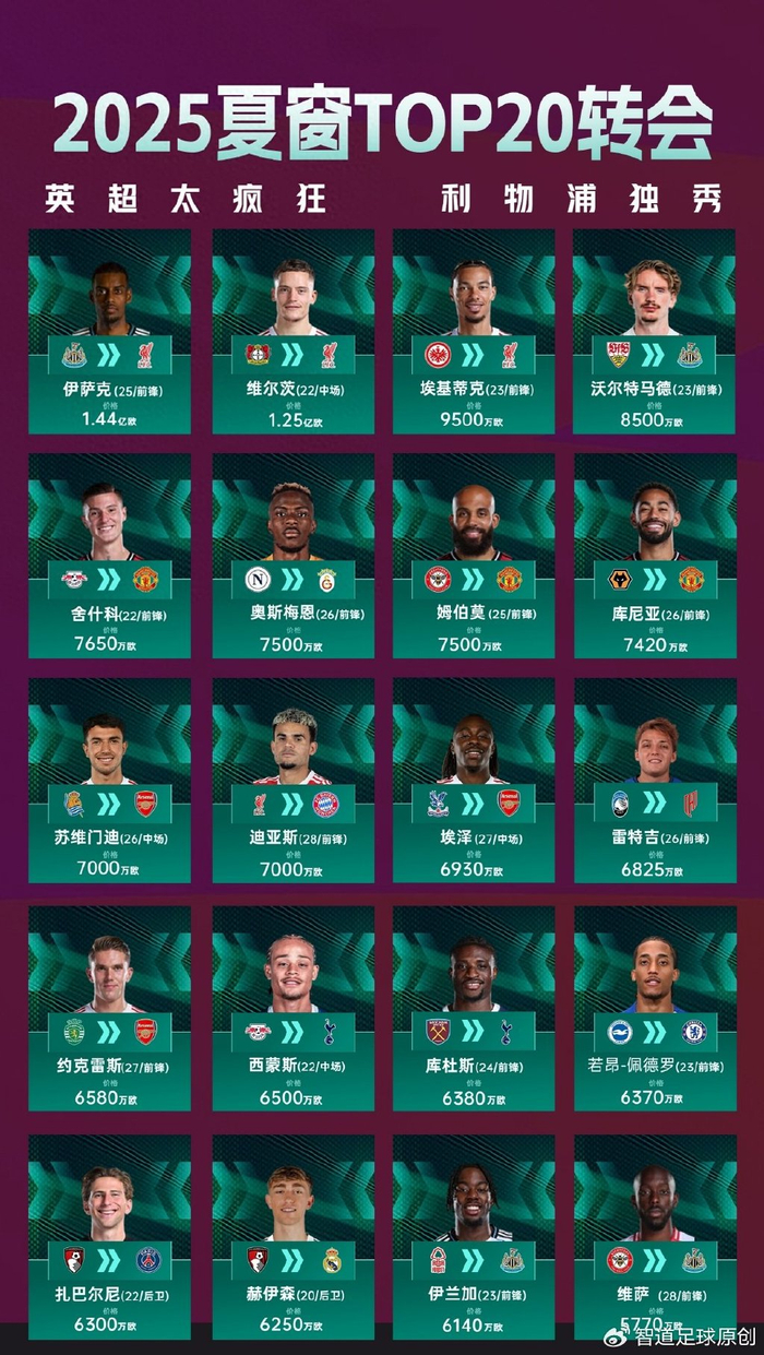 2025年夏窗轉會費前十收購以及參與入球數據: