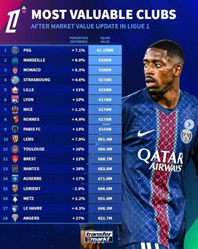法甲球會身價排行:巴黎11.5億歐斷層領先,馬賽3.98億歐次之