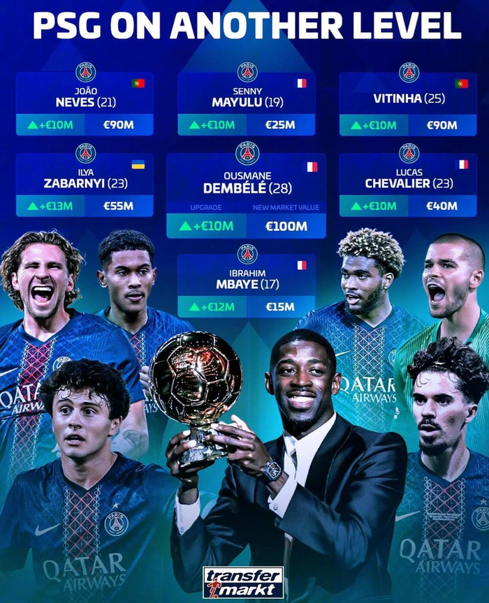德國轉會市場近期更新了法甲球員的身價,巴黎聖日耳門隊內有多名球員身價上漲: