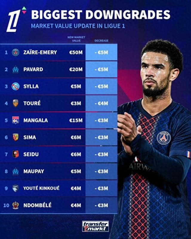 香港時間10月12日訊 德國轉會市場更新了法甲球員的身價,並列出身價下跌排名,紮伊爾-艾馬利、柏華特、西拉-500萬歐居首。