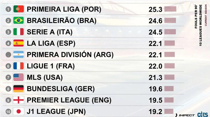 CIES足球天文台統計,今季目前為止,葡超聯賽每場平均犯規次數高達25.3次,位居全球主要聯賽每場平均犯規次數榜榜首。而英超與日職聯則以每場平均不足20次的每場平均犯規,成為最「乾淨」的聯賽。