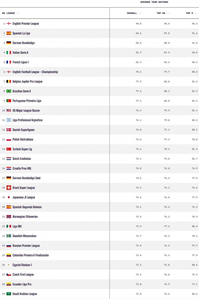 值得注意的是,英格蘭第2級別聯賽「英冠」聯賽竟然位居第6位,力壓比甲、巴甲、葡超等其他傳統足球強國的一級聯賽。而美斯所效力的美職聯,則排名第10位。