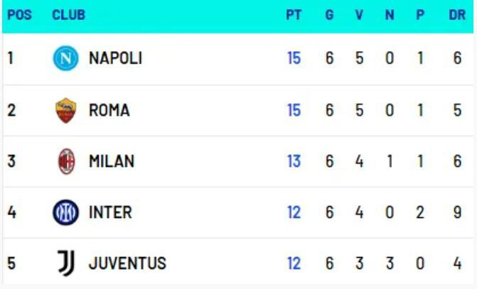 據Opta數據統計,在今季之前,在拿玻里和羅馬的歷史上,只有在1989-90賽季的意甲(自1929-30賽季以來)前6場或更多比賽後,兩隊曾一同位居積分榜榜首。