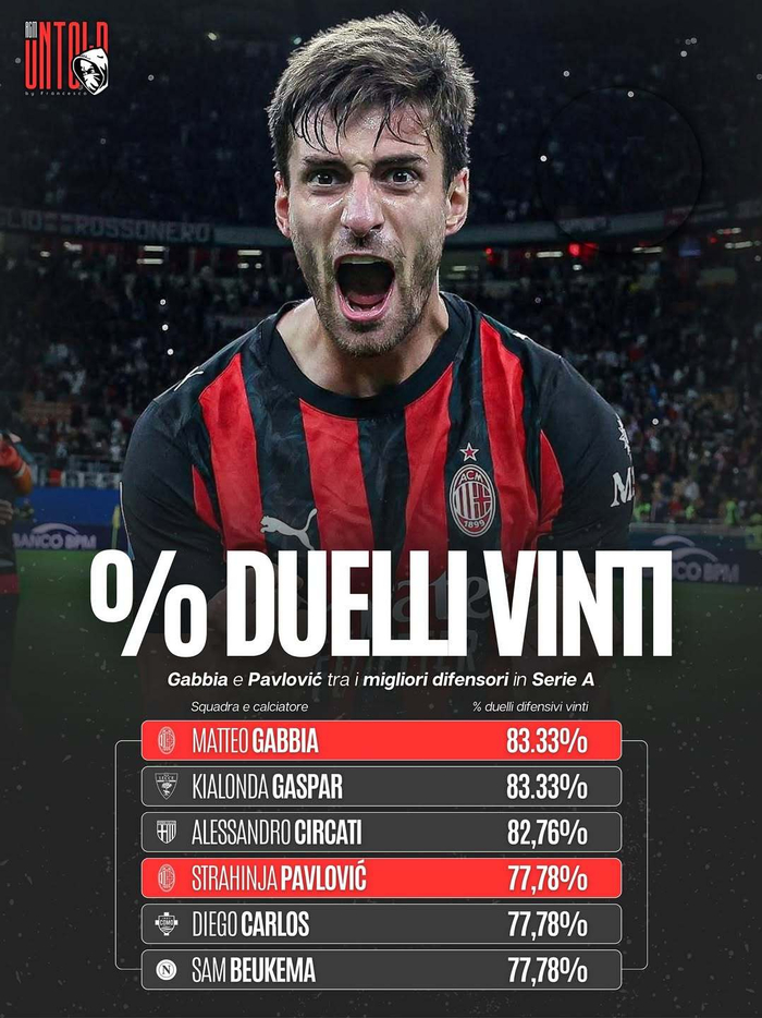 【📊】 截至今季目前為止,🔴⚫️ 基比亞🇮🇹在#意甲聯賽# 中一對一拚搶成功率最高,達到 83.33%;柏夫奴域🇷🇸排名第四,成功率為 77.78%。💪🏻#sempremilan#