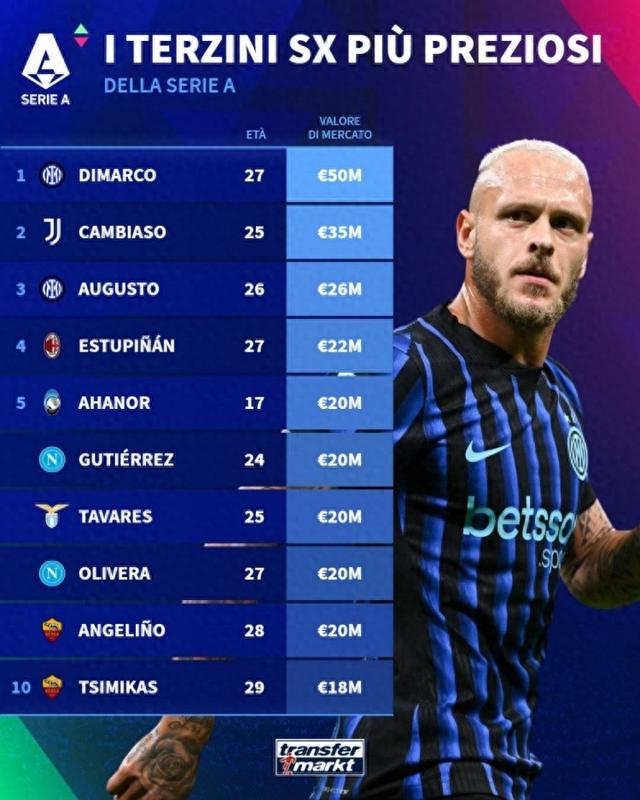 德轉盤點意甲左後衛身價排名:迪馬高5000萬歐居首