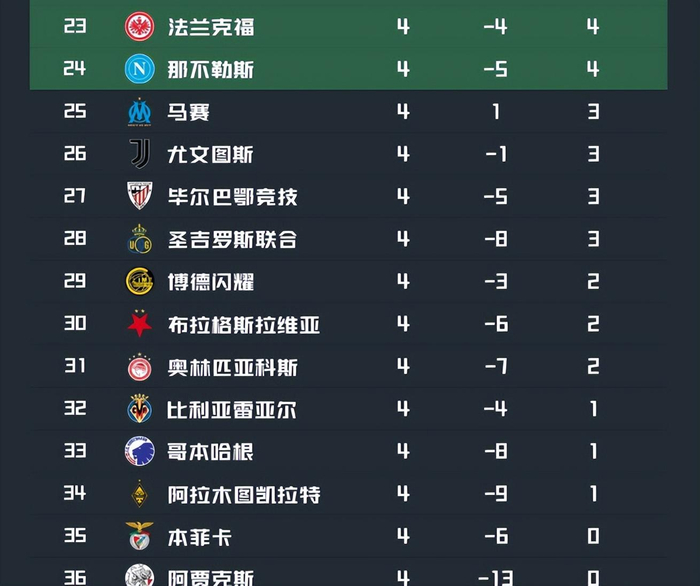 香港時間11月6日淩晨,2025/26賽季歐冠盃結束了聯賽階段第4輪的全部較量,積分榜的形勢也產生了進一步的變化。前八的晉級區當中,英超佔據半壁江山;意甲只有國米排在前八,其他3隊整體表現一般;同時還有2支球隊目前是4連敗,分別是曾經奪冠的阿積士與賓菲加。