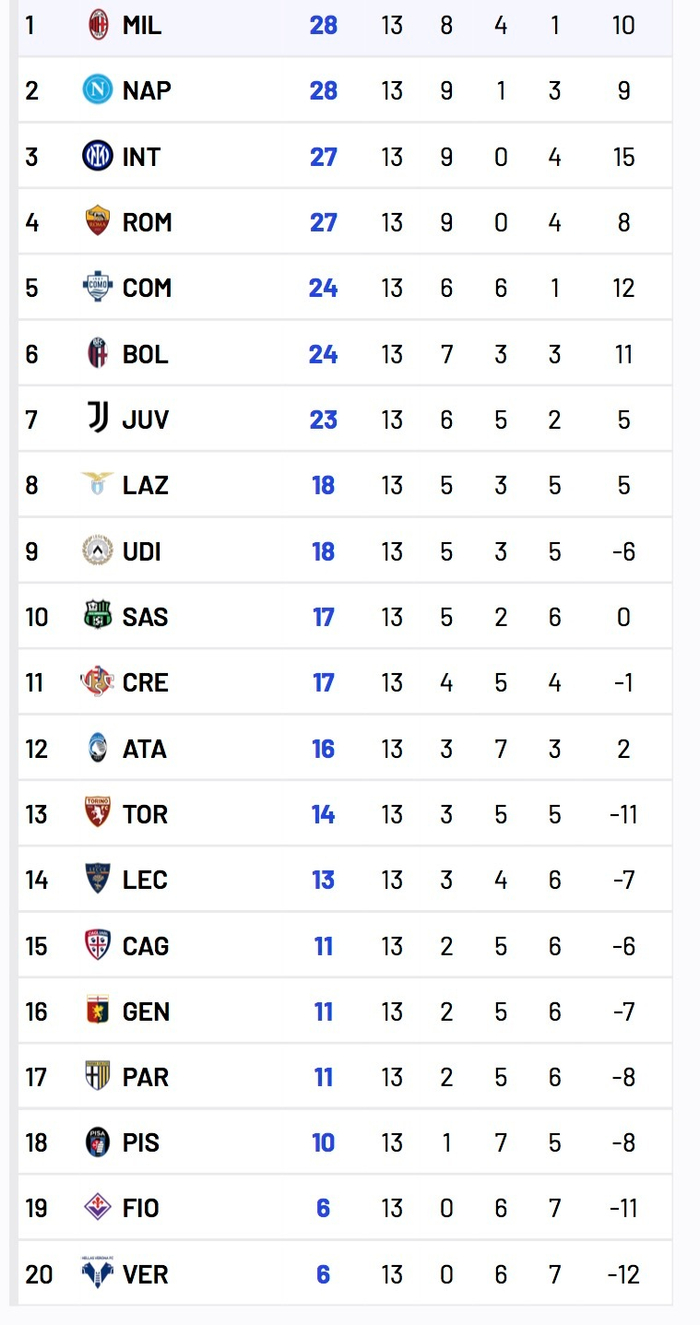 【意甲積分榜】 #意甲聯賽# 2025-26賽季意甲聯賽第13輪積分榜: