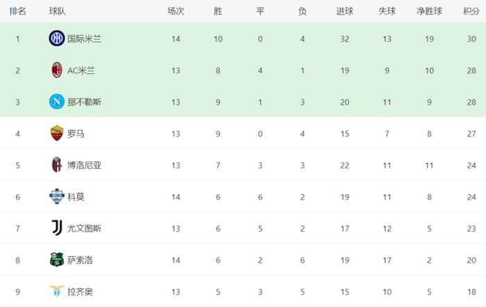 在積分榜上,國際米蘭暫時登上榜首位置。國際米蘭10勝4負,拿到30個積分。而AC米蘭和拿玻里都是28分,排名第2和第3名。不過,AC米蘭和拿玻里比國際米蘭少踢1輪。羅馬以27分排名第4。第5的是博洛尼亞,拿到24分。輸波的科木也是24分,排名第6。祖雲達斯以23分排名第7。薩斯索羅20分排名第8。拉素只拿到18分,排名第9。