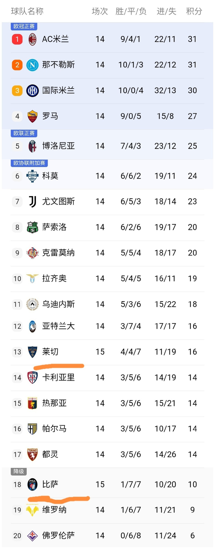 賽後萊切隊積16分升至了第13,暫時領先降班區6分之多,而比薩隊積10分繼續排名第18,落後護級區4分,很顯然基拿甸奴執教的比薩隊護級壓力很大啊。