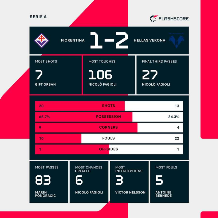 最後的失利對佛羅倫斯來說是另一個巨大的打擊,因為他們悲慘的國內比賽仍在繼續–他們現在距離安全差了八分。與此同時,維羅納目前僅落後帕爾馬兩分,排名第17位,希望他們能夠在這積極的一週的基礎上再接再厲,爭取生存。