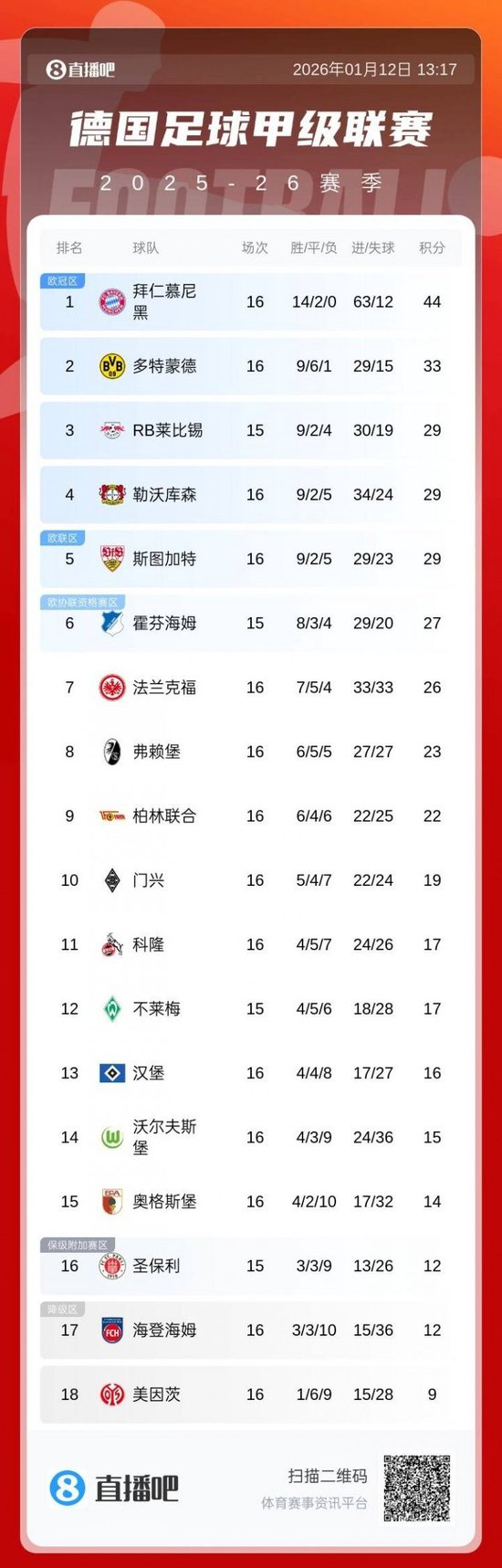 香港時間01月12日訊 德甲第16輪,拜仁8-1狂勝禾夫斯堡,半程還差一場,球隊已經是51個淨勝球+11分領跑德甲。