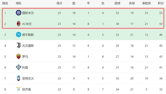 今場過後,AC米蘭在意甲迎來22輪不敗,首輪在主場意外輸給基爾莫內塞之後,AC米蘭在意甲再無敗績,期間他們取得14勝8平的成績。在積分榜上,AC米蘭以50分排名第二,落後榜首的國米5分。儘管拿玻里已經開始掉隊,但是意甲還有AC米蘭能夠給國米製造威脅,今季爭冠還有很大的變數。