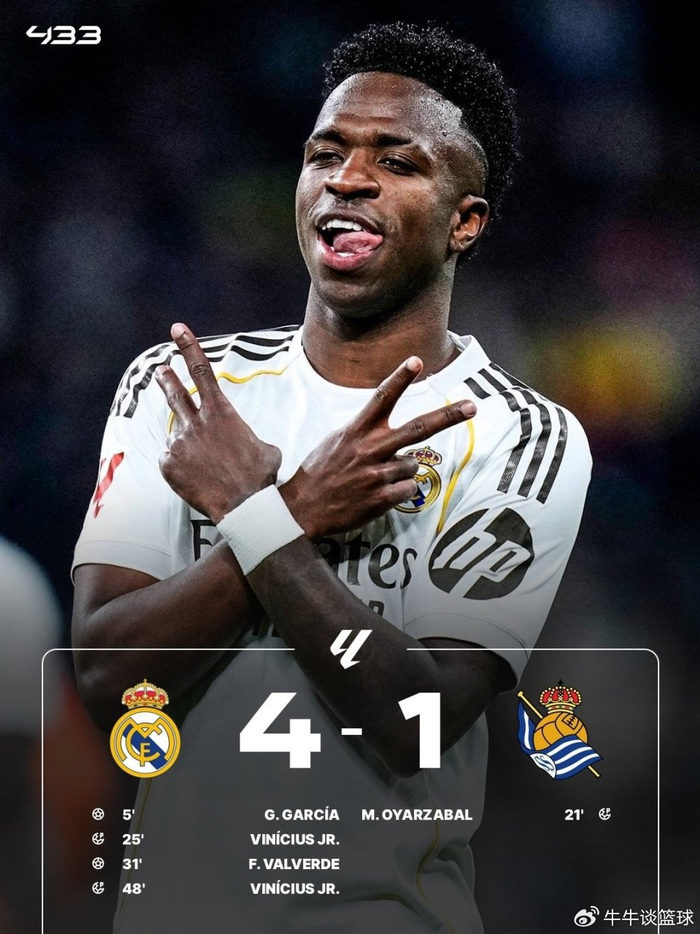 西甲第24輪,皇馬主場4-1擊敗皇社,先賽60分登頂。阿諾特妙傳助攻貢薩洛先拔頭籌,赫伊森送點,奧耶沙巴爾點射扳平,雲尼斯奧斯兩次造點+點射,華維迪遠射破門。
