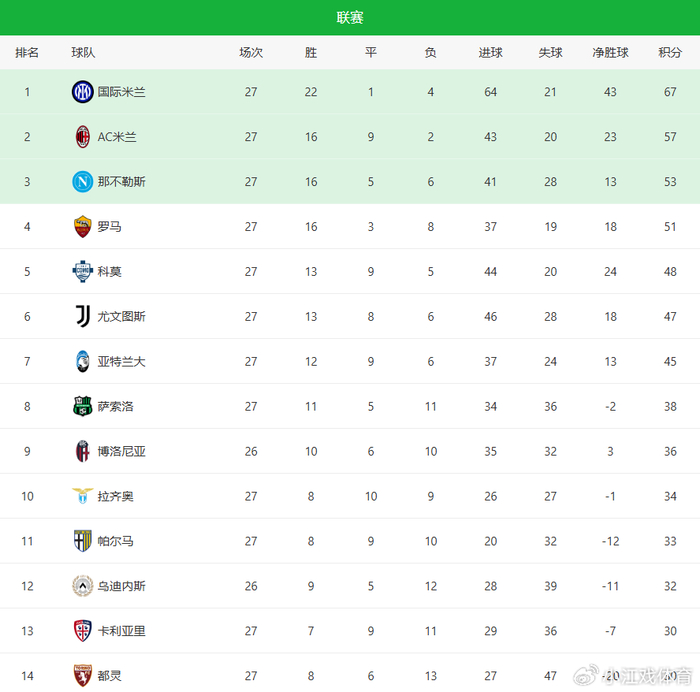 隨著AC米蘭2-0+祖記3-3絕平羅馬!意甲最新積分榜2-6名差10分