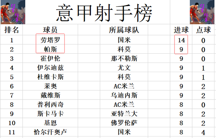 射手榜方面,還是羅達路14球領跑,帕斯,利安,伊爾迪茲,杜維卡斯,霍伊倫等人9球並列第2。普列錫今天沒有入球,還是和斯卡馬卡,堅尼,卡漢路古等人8球剛好擠入前十。