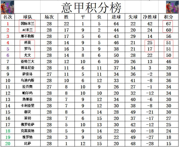 積分榜方面,AC米蘭今天擊敗國米後,多少還是挽留了些爭冠懸念,將和國米的分差拉回到個位數,10輪追7分還是有機會的。拿玻里差國米11分排在第3。爭四很激烈,黑馬科木淨勝球優勢力壓羅馬位列前4,祖記1分之差排在第5。