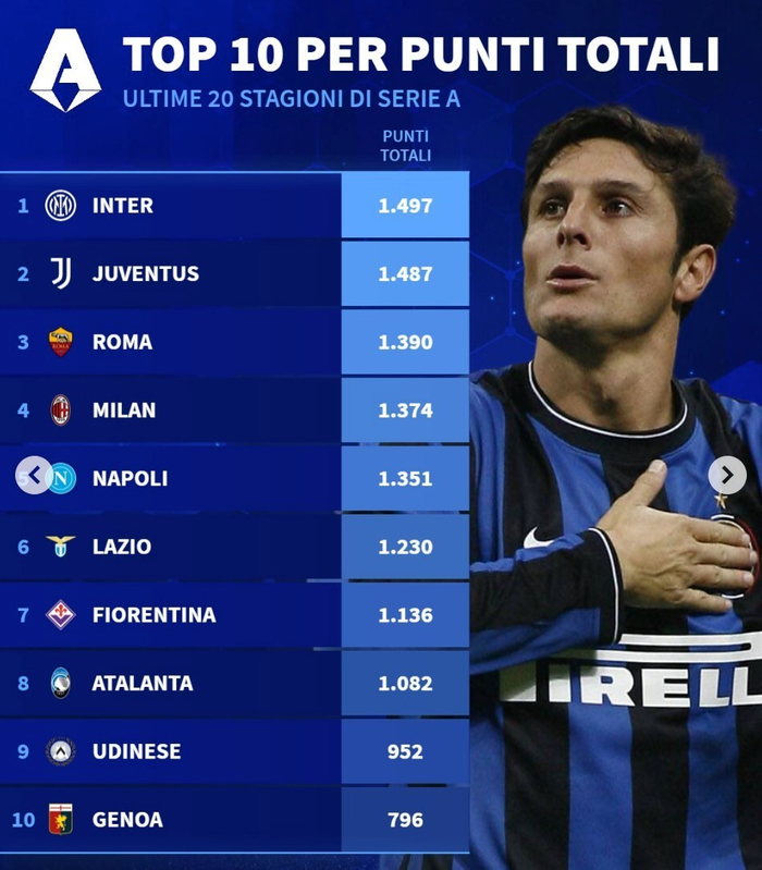 意甲近20年每場平均積分:祖記第1,國米第2,米蘭僅位列第5
