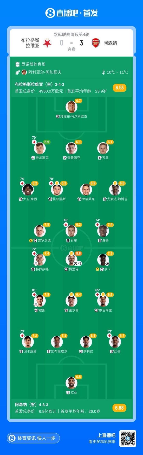 香港時間11月5日訊 香港時間11月5日淩晨1時45分,歐冠盃聯賽階段第4輪,阿仙奴作客西諾博球場對陣布拉格斯拉維亞。上半場,普羅禾特手球犯規送點,沙卡點射首開紀錄。阿仙奴半場1-0領先布拉格斯拉維亞。下半場,馬連奴攻入兩球,15歲零308天的道曼後備登場,成為歐冠盃有史以來最年輕登場球員。最終阿仙奴3-0擊敗布拉格斯拉維亞,各項賽事取得十連勝+歐冠盃4輪全勝,連續8場零封對手!