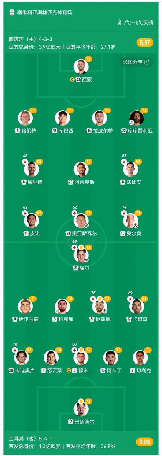香港時間11月19日訊 世盃外歐洲區小組賽E組第6輪,西班牙坐鎮主場西維爾奧林匹克球場迎戰土耳其。上半場,奧爾莫閃擊破門,居爾扳平比數。易邊再戰,耶馬斯倒掛被撲,奧斯簡貼地箭反超比數,奧耶沙巴爾建功。最終西班牙2-2土耳其。積分榜方面,西班牙16分第一直通,土耳其13分進附加賽。