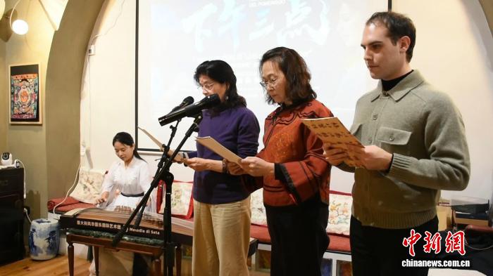 活動中,羅馬市民與活動意方發起人胡蘭波在古箏伴奏下,用中意雙語朗誦了由烏爾比諾大學生翻譯的王計兵四首詩作。(主辦方供圖)