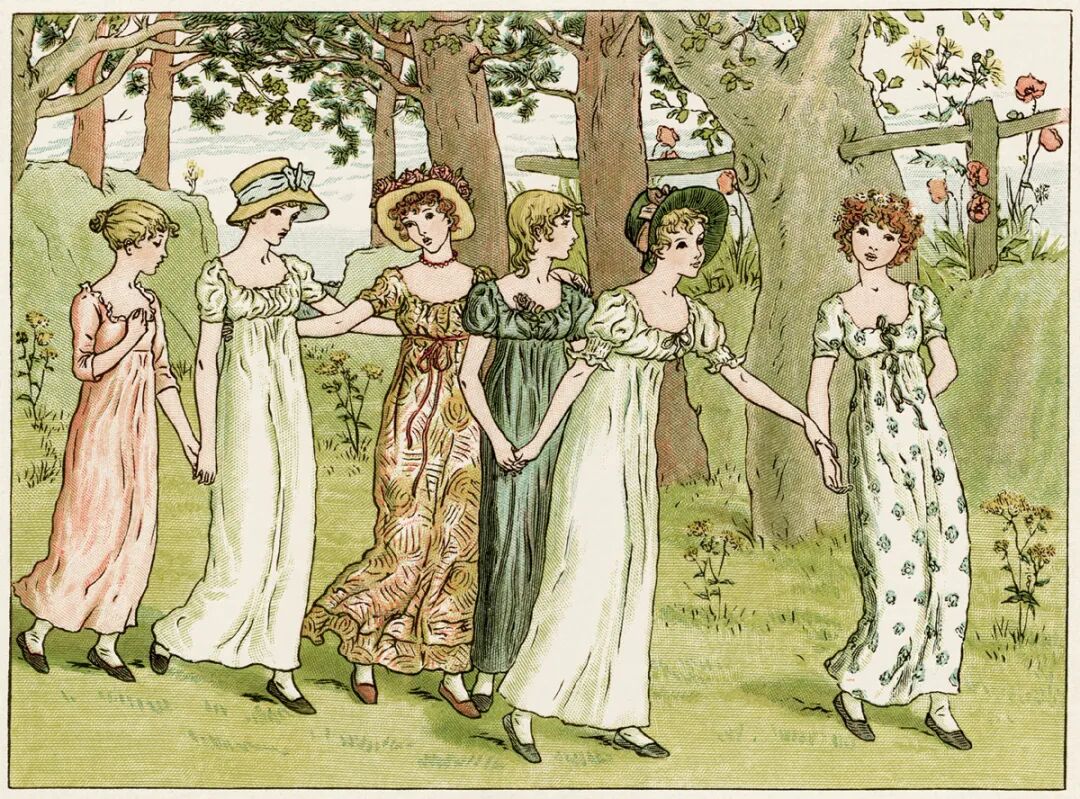 女性畫家凱特·格連納威最初為《笨拙》《倫敦新聞畫報》創作木刻版畫,1879年她出版了第一部圖文並茂的《窗下》,後來接連出版了多部作品,這些插圖風格優雅秀麗、富有奇趣,甚至影響了社會上的服裝款式,在書籍插圖方面引發了一場革命。英國圖書館協會1955年設立凱特·格連納威獎,是世界圖畫書領域三大獎項之一。圖為凱特·格連納威的插圖作品。