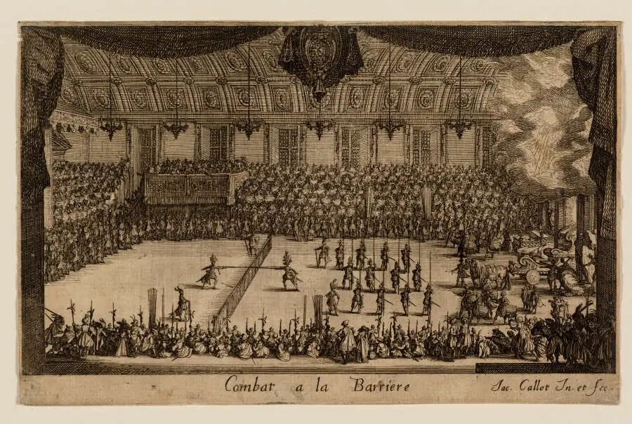 圖為1627年卡洛與克洛德·德魯特合作出版的「節慶書」《柵欄之戰》的插圖,表現了當年洛林公爵宮廷舉辦的一場宮廷比賽,這場比賽是對強有力的鄰邦公爵夫人表示敬意而舉行的一次娛樂活動,同時也寓意了洛林公爵對鄰邦的政治態度。