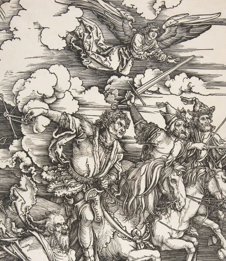 1498年,丟勒出版了《啟示錄》這部在藝術史上具有重大意義的插圖書。《啟示錄》共有木刻版畫插圖15幅,耗時3年完成,作品人物造型準確多樣,畫麵線條充滿了張力,讓觀者感受到自由的氣息。丟勒將木刻版畫技巧運用到空前成熟的程度,《啟示錄》的刊行也讓他在當時聲名鵲起。