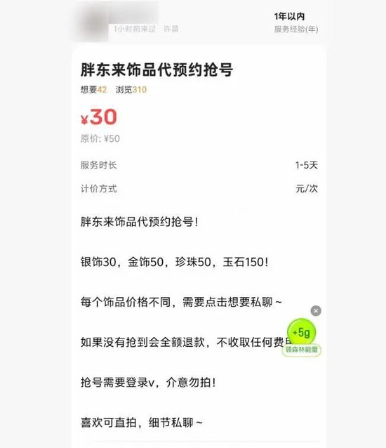 由於胖東來的黃金首飾比較受歡迎,商家要求消費者提前在胖東來珠寶小程序實名預約,且金條方面每人限購200克。並且,消費者進行實名預約購買黃金時,人需要在線下門店50公里內。在二手平台,還有人推出代預約服務,其中購買黃金的代預約服務費為50元。