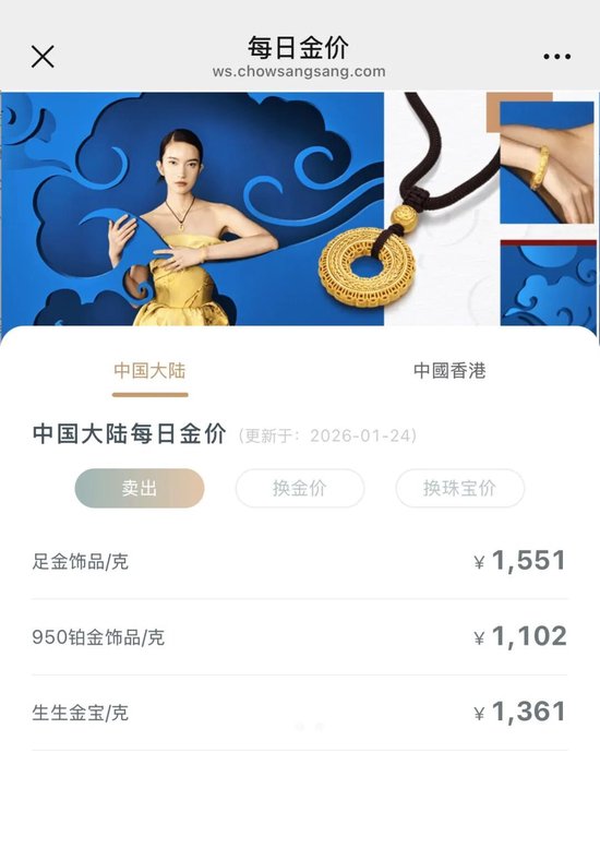 24日,記者查詢到:周生生足金飾品標價1551元/克,較前一日1545元/克上漲6元/克。老廟黃金足金飾品報1560元/克。