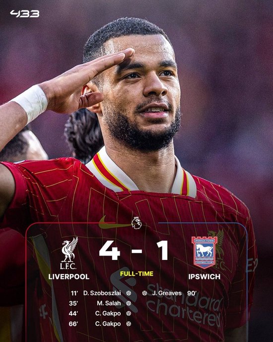 利物浦主場4-1擊敗葉士域治,少賽1場領先6分。蘇保斯拉爾破門,加克波2球1助攻,沙拿建功,基里夫斯頭槌扳回一城。