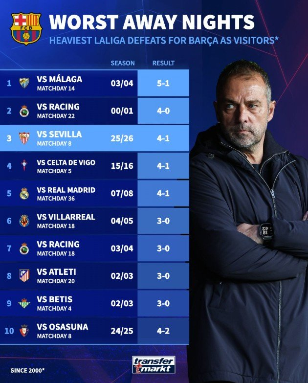香港時間10月7日訊 巴塞隆拿本輪聯賽作客1-4不敵西維爾,德轉統計了巴塞隆拿本世紀西甲作客輸波紀錄,他們曾1-5不敵馬拉加,3次1-4輸波。