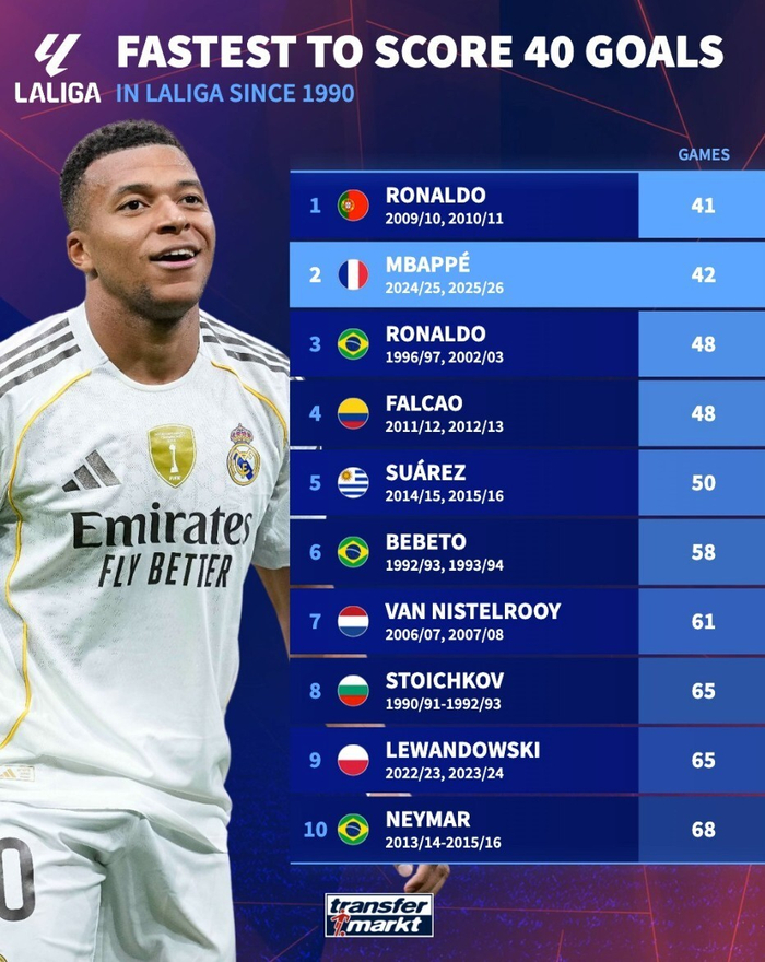 42場,麥巴比是90年以來僅次於C.朗第二快達成西甲40球的球員
