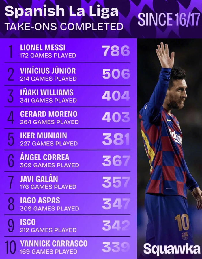 Squawka統計了16/17賽季以來,西甲聯賽中完成最多次過人的球員: