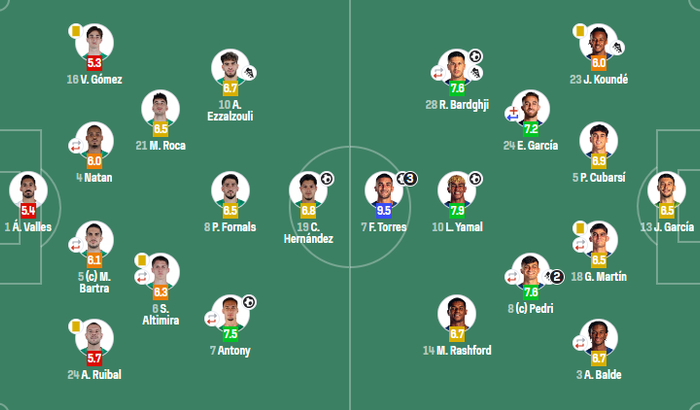 巴塞隆拿(4-2-3-1):霍安-加西亞;高迪,庫巴西,赫拉德-馬田(63′迪莊),巴爾德(46′基斯甸臣);艾力-加西亞(81’托倫茨),柏迪(63’巴爾納爾);巴德吉63’費爾明),亞馬爾,拉舒福特;費蘭-托利斯