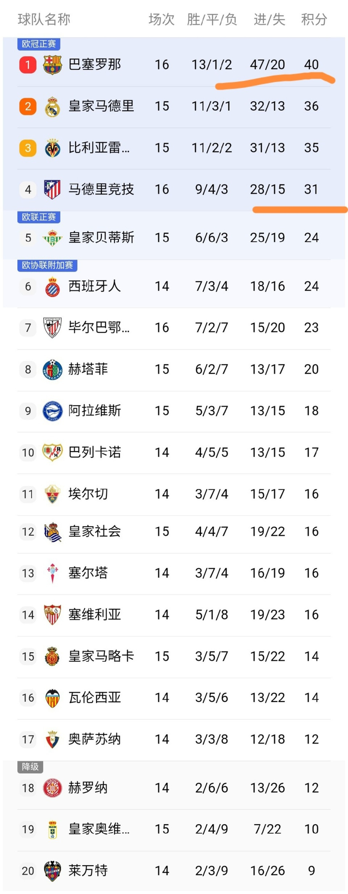 可以看到巴塞隆拿積40分了,先賽的情況下領先皇馬4分之後,皇馬本輪如果輸波,那麼巴塞隆拿將拉大分差,所以皇馬本輪面對切爾達不可以爆冷失分啊。第三的維拉利爾隊積35分僅落後第2的皇馬1分,馬體會積31分落後榜首的巴塞隆拿9分,可以看到第一和第4的分差已經拉大到了9分,這個分差還是比較大的,也就是說西甲爭冠依然就是在皇馬和巴塞隆拿之間,維拉利爾隊能否成為真正的挑戰者還有待進一步的觀察。我們可以看到老牌勁旅華倫西亞、西維爾排在十名開外。特別是華倫西亞逼近降班區,令人唏噓不已!