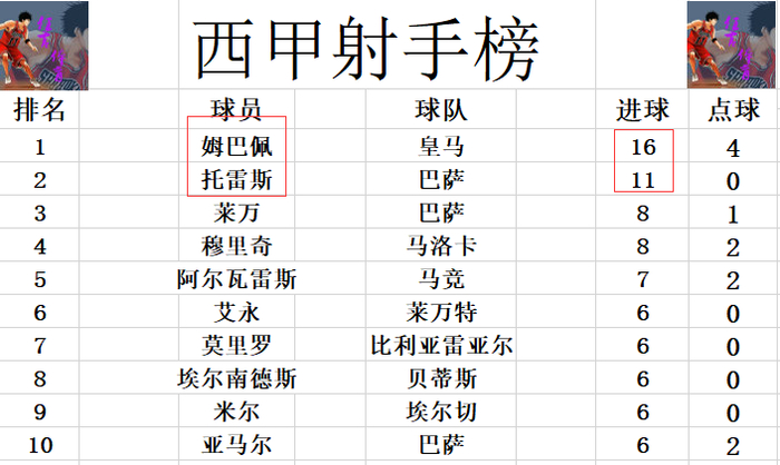 射手榜方面,麥巴比16球高居榜首,托利斯11球緊隨其後。利雲,梅歷治8球並列第3,阿爾艾華斯7球第5。亞馬爾,米爾,靴南迪斯等人6球剛好擠入前十。