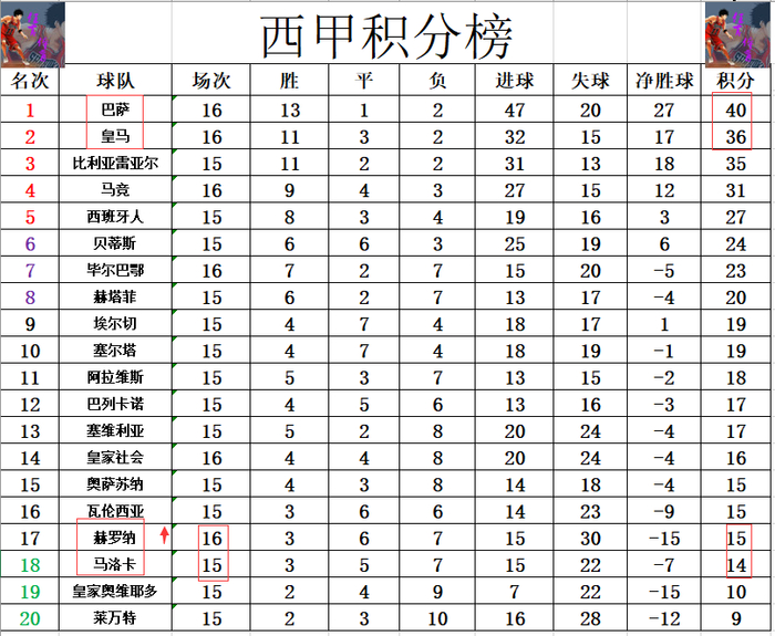 積分榜方面,皇馬近段時間的防守猶如豆腐渣,大有崩盤之勢,從領先巴塞隆拿5分到現在落後巴塞隆拿4分。赫羅納逆轉擊敗皇家蘇斯達後,暫時超過馬略卡1分逃出降班區,輸波的皇家蘇斯達只比降班區高了2分。