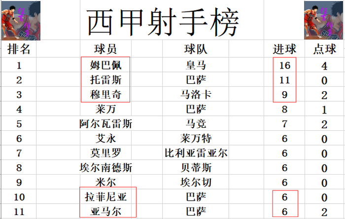 射手榜方面,麥巴比16球高居榜首,托利斯5球之差位列第2。梅歷治今天攻入一球,超過利雲獨居第3,利雲8球第4。拉芬拿梅開二度,追上亞馬爾,米爾,靴南迪斯等人,6球剛好擠入前十。