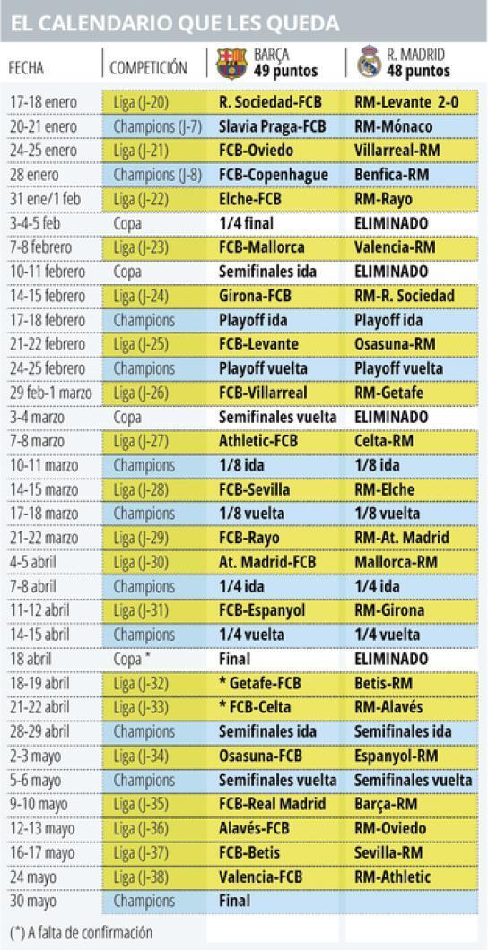 在歐冠盃16強次回合比賽之後,他們將會對陣他們將在歐冠盃16強次回合比賽後,迎戰華歷簡奴、皇家蘇斯達、基達菲、艾爾切和馬德里體育會,之後還將對陣赫羅納、艾拉維斯、奧維耶多和畢爾包。