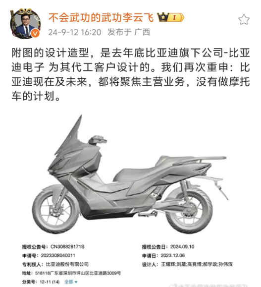 新浪科技訊9月12日下午消息,比亞迪集團品牌及公關處總經理李雲飛於微博發文,回應了外界對於比亞迪造摩托的傳聞。李雲飛表示,“我們再次重申:比亞迪現在及未來,都將聚焦主營業務,沒有做摩托車的計劃。”