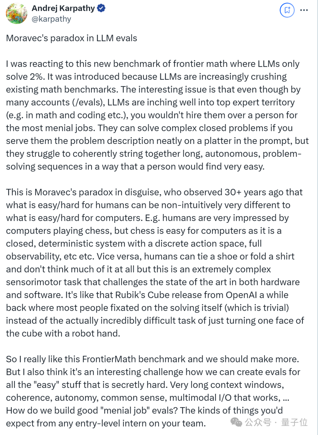 這也合了卡帕西的心意,他認為這樣的新基準應該更多,尤其是為那些看似「容易」的事情創建評估。