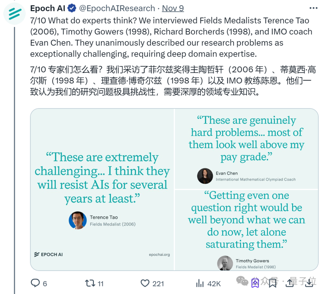 為了進一步驗證FrontierMath的難度,該機構還特意採訪了4位數學大佬。
