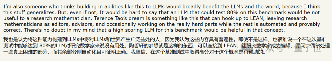 陶哲軒夢想的就是這樣的東西,可以連接到LEAN(微軟研究院推出的一款定理證明器),讓數學家成為編輯、顧問,偶爾處理一些真正困難的部分,而其餘部分則自動化且可證明正確。