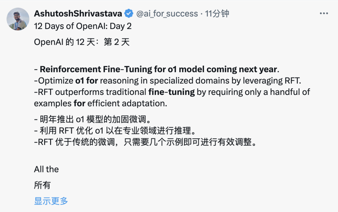 強化微調(RFT)將於明年推出,專門針對 o1 模型。
