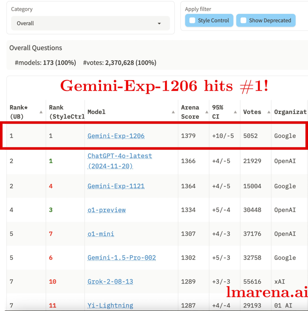 而就在 OpenAI 發佈會召開前,Google 推出的新模型 gemini-exp-1206 在大模型競技場 LMSYS Chatboat Arena 中再次登頂,力壓 OpenAI 的 GPT-4o-1120。