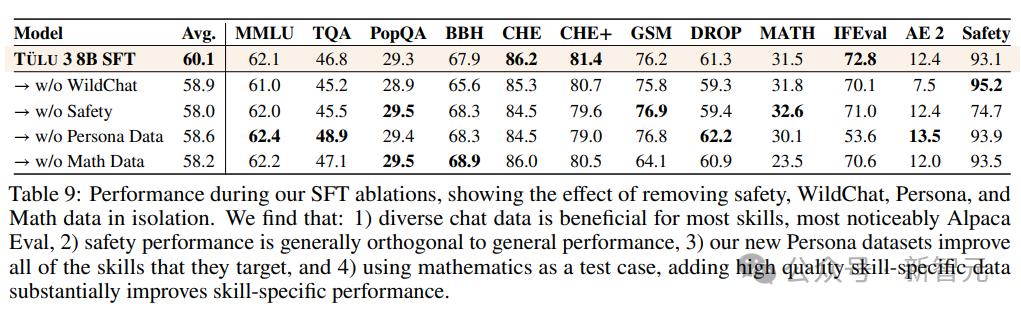 1. 多樣化的聊天數據:主要來自WildChat,如果移除該數據集,可以看到大多數技能都有小幅但明顯的下降,尤其是在Alpaca Eval上,凸顯了「多樣化真實世界數據」的重要性。