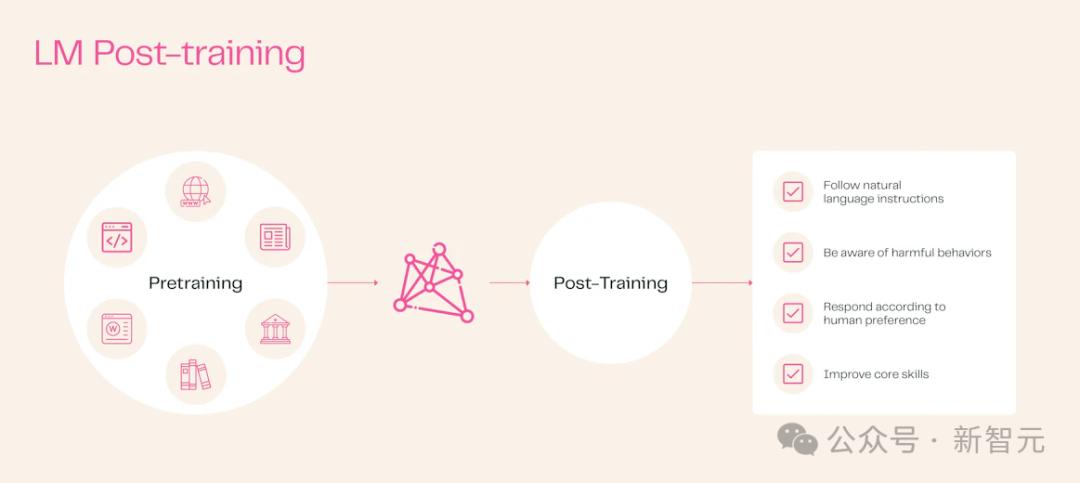 只進行過「預訓練」的模型是沒辦法直接使用的,存在輸出有毒、危險信息的風險,也無法有效遵循人類指令,所以通常還需要進行後訓練(post-train),如「指令微調」和「從人類反饋中學習」,以使模型為各種下遊用例做好準備。