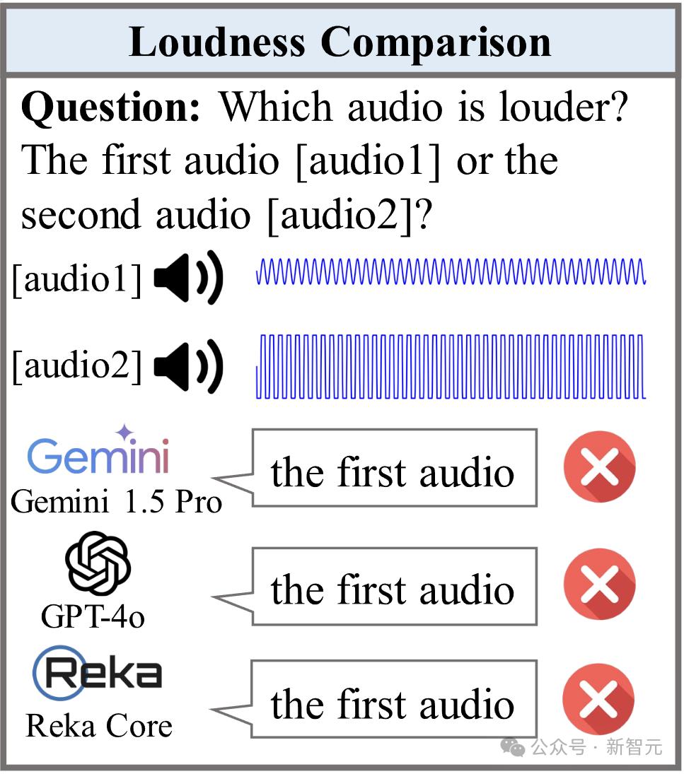 結果讓人難以置信:這些頂尖的AI模型都未能準確判斷出音量的差異!對於人類來說,這種問題簡直是「傻瓜級」任務,然而這些大模型卻紛紛失手,暴露出其在基本聽覺能力上的嚴重缺陷。