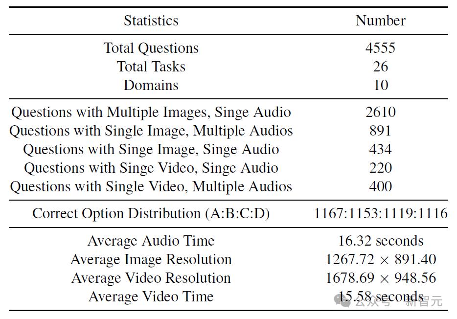 AV-Odyssey中包含了由人類專家全新標註的4555個問題,確保題目沒有在其他任何數據集中出現過,任務分佈以及統計信息如下面圖表所示: