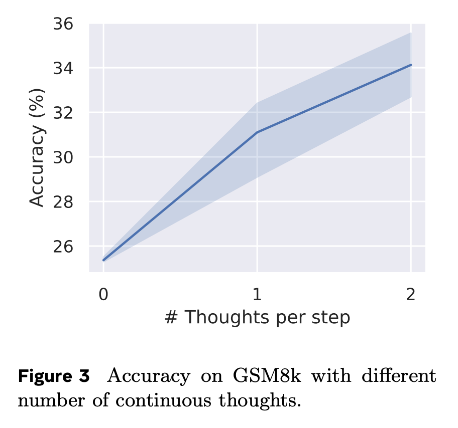 在 GSM8k 數據集的實驗中,Coconut 的表現優於其他採用類似策略訓練的架構,特別是超過了最新的 iCoT 基線,也顯著優於同樣能增加計算能力的 Coconut(pause as thought)變體。
